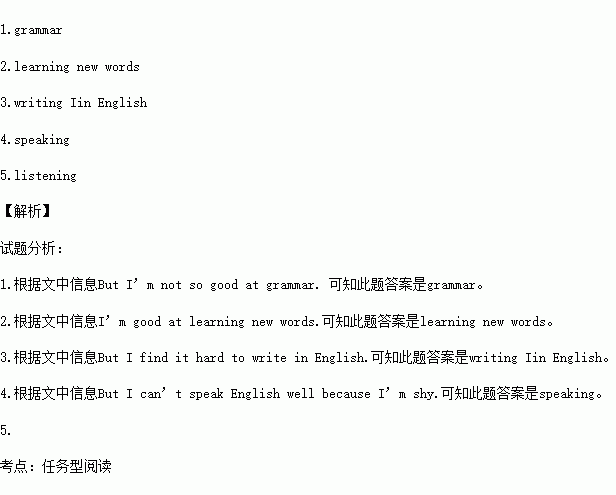 My English is good. I do well in listening, learning grammar and writing in English. But I can’t speak English well because I’m shy.
