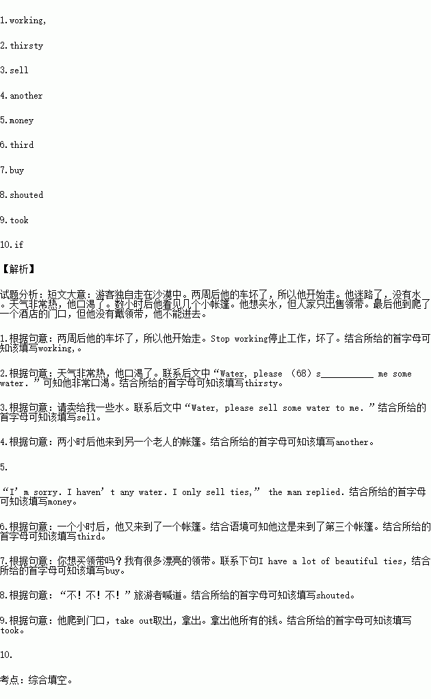 A tourist was travelling alone in the desert.After two weeks his car stopped1.w_______, so he started walking.He was lost and had no water.It was very hot and he became very 2.t___________.After five hours he saw a small tent.There was a woman in it.The tourist said to her, “Water, please 3.s___________ me some water.”
