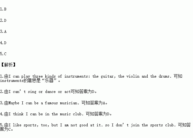 My name is Tom.I want to join a club in my school.I’m not famous(著名的)now,but maybe I can be famous someday.I can’t sing or dance or act,but I can do many other things.I can play three kinds of instruments:the guitar,the violin and the drums.I think I can be in the music club.Maybe I can be a famous musician.I like to read storybooks and I can write stories.Maybe I can be a famous writer.I like sports,too,but I am not good at it,so I don’t join the sports club.