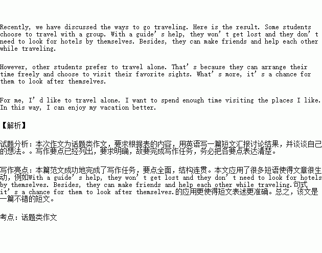 ÔÚÓ¢Óï¿ÎÉÏ£¬Í¬Ñ§ÃǾÍ×Ô¼ºÏ²»¶µÄÂÃÓη½Ê½Õ¹¿ªÁËÌÖÂÛ¡£ÇëÄã¸ù¾ÝϱíÄÚÈÝ£¬ÓÃÓ¢Óïдһƪ¶ÌÎĻ㱨ÌÖÂÛ½á¹û£¬²¢Ì¸Ì¸×Ô¼ºµÄÏë·¨¡£