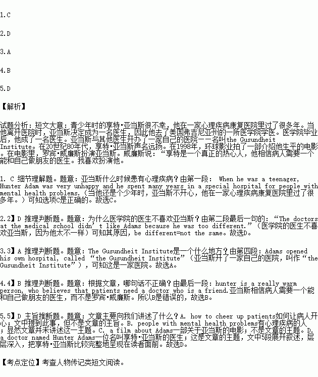 When he left the hospital, Adam decided to become a doctor, so he went to a medical school in Virginia, USA. But when he was there, he did things in a different way. For example, he didn’t like the doctor’s white coats, so he wore shirts with flowers on them when he visited his patients and he tried to make them laugh. The doctors at the medical school didn’t like Adams because he was too different.