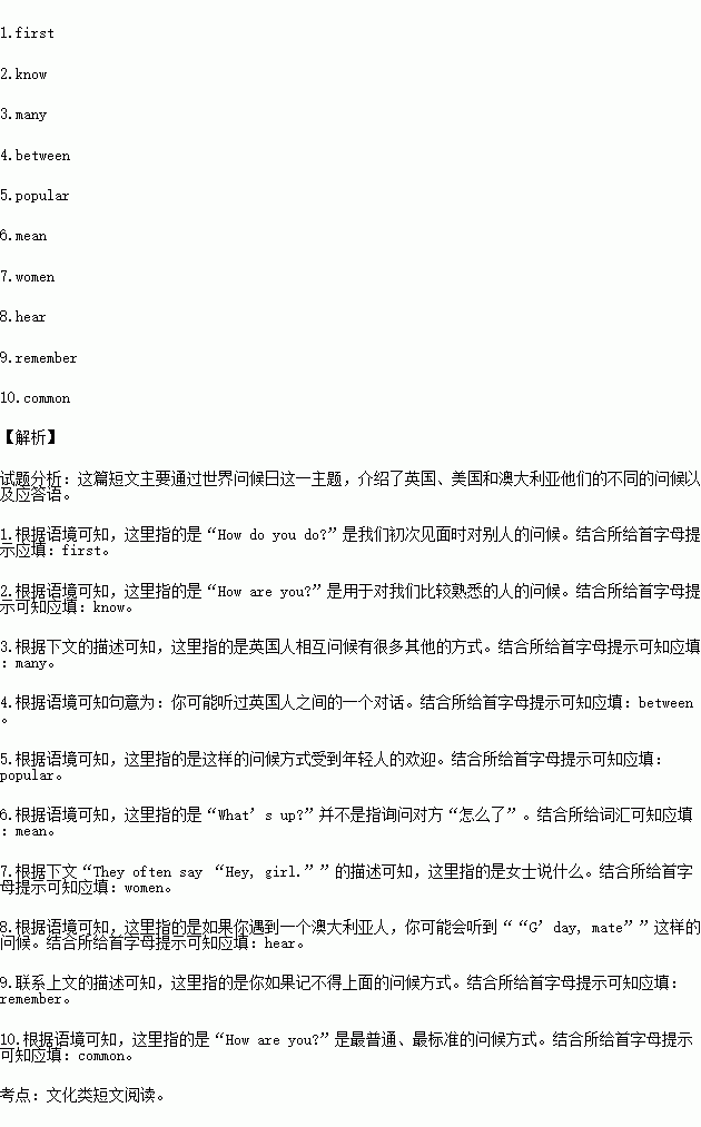 You may hear a conversation b 4. British people: “You all right?” “Yeah, you?” “I’m good. Any plans for the weekend?” or “How’s it going?” “Yea, fine, and you?”. These ways of greeting are p 5. for young people to say hello to friends.