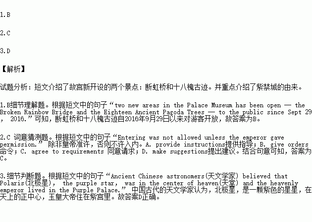 Then where did purple come from? Ancient Chinese astronomers(天文学家) believed that Polaris(北极星), the purple star, was in the center of heaven(天堂) and the heavenly emperor lived in the Purple Palace. So the palace for the emperor on Earth was called “the purple city”. Entering was not allowed unless the emperor gave permission.