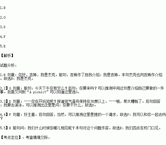 A.My name is Jack. B.This is Jack. C.I’m going fishing. D.What are you going to do then? E.Let’s meet at our school gate at 4 o’clock. F.Can I go with you? G.I’m going for a picnic. |