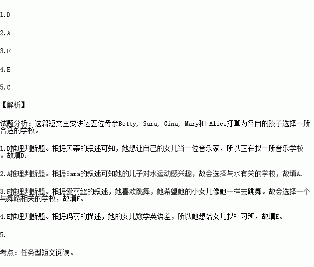 配对阅读。左栏的五位母亲打算为各自的孩子选择一所学校,请在右栏信息中选出符合个人要求的最佳选项。