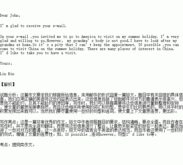 假如你叫林斌,你美国友好学校的朋友John给你发来e-mail,邀你暑假前往美国游玩。你因故不能赴约,请给他回复。