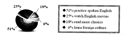 最近,学校就空中俱乐部的英语学习内容设置做了意向调查(结果见下面图表)。请你帮俱乐部用英语写一篇报告,并谈谈你自己的想法或建议。
