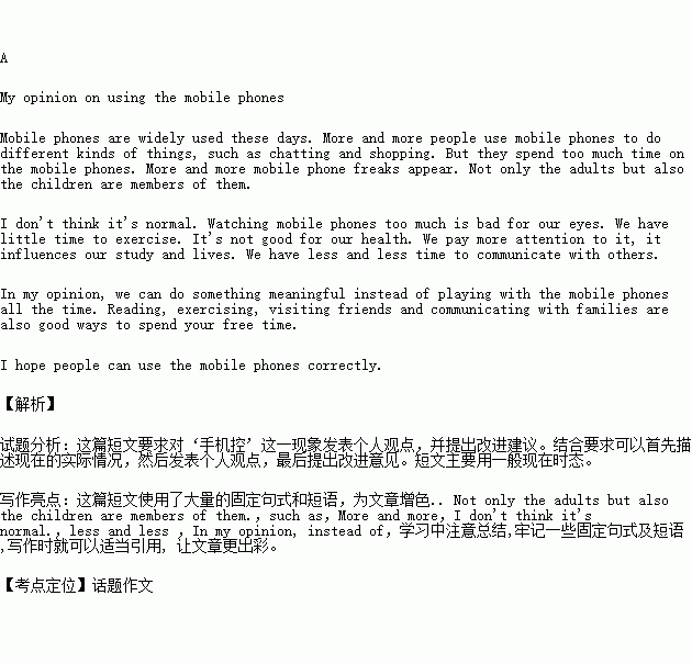 话题作文:近来网络上流行一句话:“世界上最远的距离是我在你对面,你却在看手机。”这句话真实反映了当前的社会现象,“手机控”,“低头族”越来越多且呈年轻化趋势。请你以“My opinion on using the mobile phone"为题针对这一现象发表个人观点,并提出改进建议。
