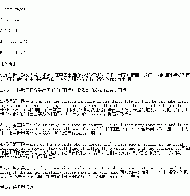 Disadvantages | ● Language barrier is the biggest problem. Because students are not skilled at the language spoken there, they will have difficulty in 4.________ what the teachers say. ● It is not easy for them to deal with different situations. |