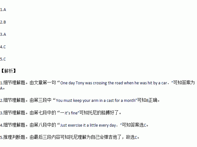 One day Tony was crossing the road when he was hit by a car.He fell and broke his arm.