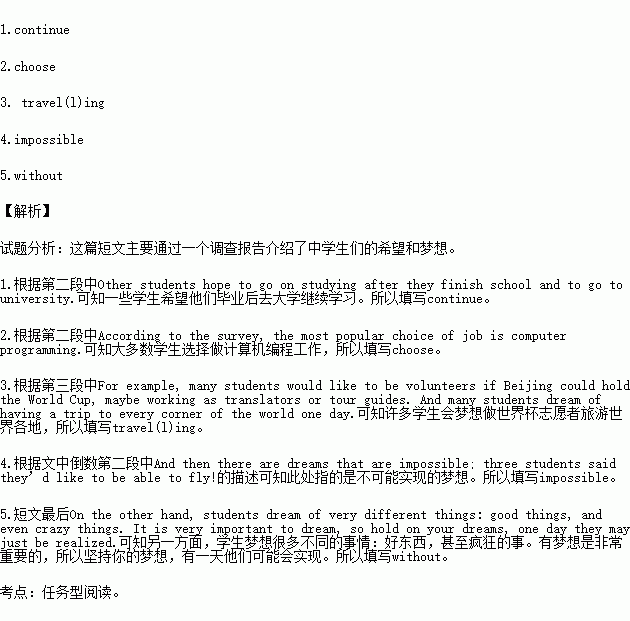 What are the dreams of teenagers? Teenagers have all kinds of dreams. Some are more realistic (现实的) than others. For example, many students would like to be volunteers if Beijing could hold the World Cup, maybe working as translators or tour guides. And many students dream of having a trip to every corner of the world one day.