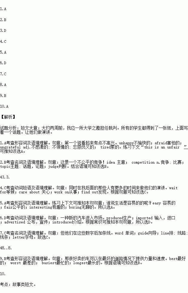 Around two weeks ago, I was invited to be a judge(裁判) at a college.All of the students had been given a piece of paper with a topic written on it.The first one to speak looked a little .“My dear friends and judges,” he said loudly, “this is an unfair ! I have been given the paper,” he continued, “to speak on the topic with just a few minutes’ preparation, those who come after me have more time to their speeches!” He then left the stage and went out of the hall.