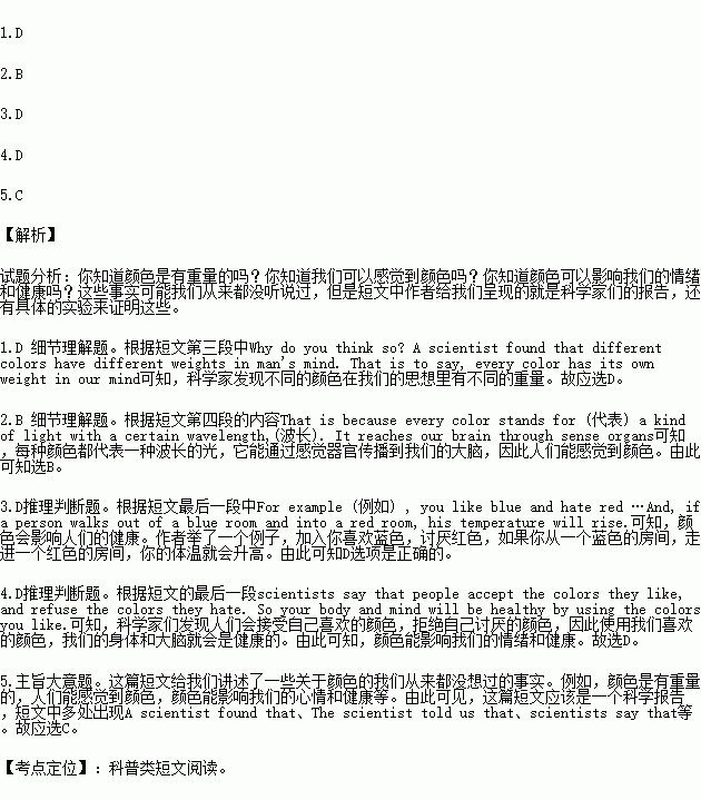 The scientist told us that colors also have smell. Can you smell the color? Of course not. Then why did the scientist say S07 That is because every color stands for (代表) a kind of light with a certain wavelength,(波长). It reaches our brain through sense organs According to this discovery, scientists say that people accept the colors they like, and refuse the colors they hate. So your body and mind will be healthy by using the colors you like. Or you'll be nervous or even get ill. For example (例如) , you like blue and hate red. If you stay in a room with red windows, wallpaper and furniture(家具) for two hours, you'll feel you have been there for four hours. But if the room is blue, you'll feel you have been there for only an hour. And, if a person walks out of a blue room and into a red room, his temperature will rise.