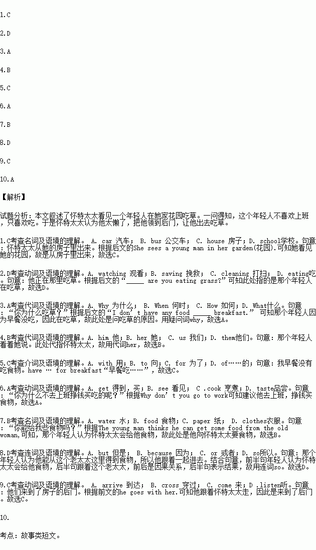 It’s sunny today. Mrs. White goes out of her_____ . She sees a young man in her garden(花园). He is ____ grass(草) there. Mrs. White comes to the young man and asks, “_____ are you eating grass?” the young man looks at _____ and says, “I don’t have any food _____ breakfast.”