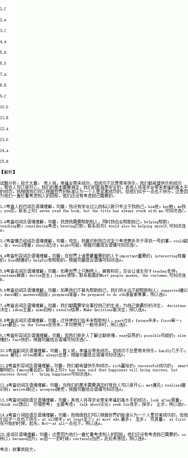 It has been said that happiness will bring success, but success doesn’t bring happiness. We all want to be happy and . For some of us can be very happy when our basic needs are and our family are safe. Others will high levels of success thinking that will bring happiness. I’m sure we can think of a person who is very successful, according to the world’s standards (标准), but they don’t appear to be happy . This is they have been so busy working for somebody’s goals that they haven’t considered their own needs.
