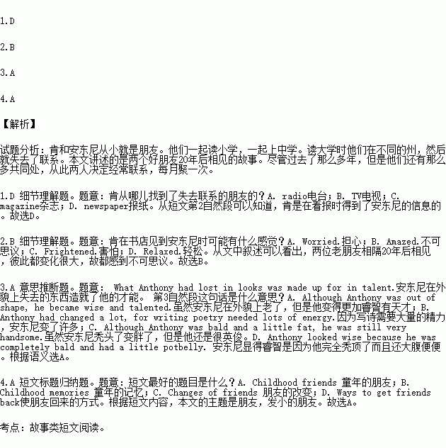 Ken sat in the last row of the area set up inside the bookstore. When Anthony was introduced and came up the podium, Ken hardly recognized him. Anthony was almost completely bald and had a little potbelly (大肚子). When Anthony was in high school, he was very handsome. What Anthony had lost in looks was made up for in talent. Anthony’s poetry was quite good.