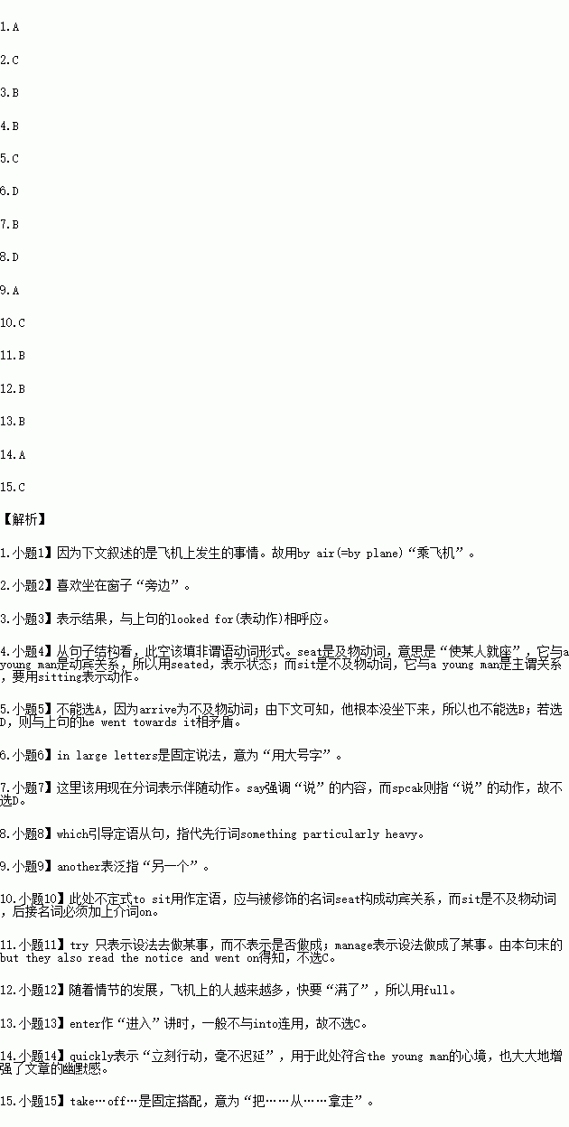 Mr.Robinson had to travel somewhere on business,and as he was in a hurry,he decided to go by________.He liked sitting________a window when he was flying,so he got onto the plane and looked for a window seat.He________all of them taken except one.There was a young man________beside it,and Robinson was surprised that he had not taken the one by the window.Anyhow,he went towards it.