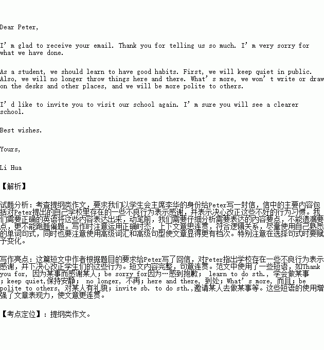 拿大中学生Peter在你校学习期满,回国后写一一封感谢信,同时指出了同学们的一些不良行为。假如你是学生会主席李华,请根据要点提示给Peter回一封电子邮件。