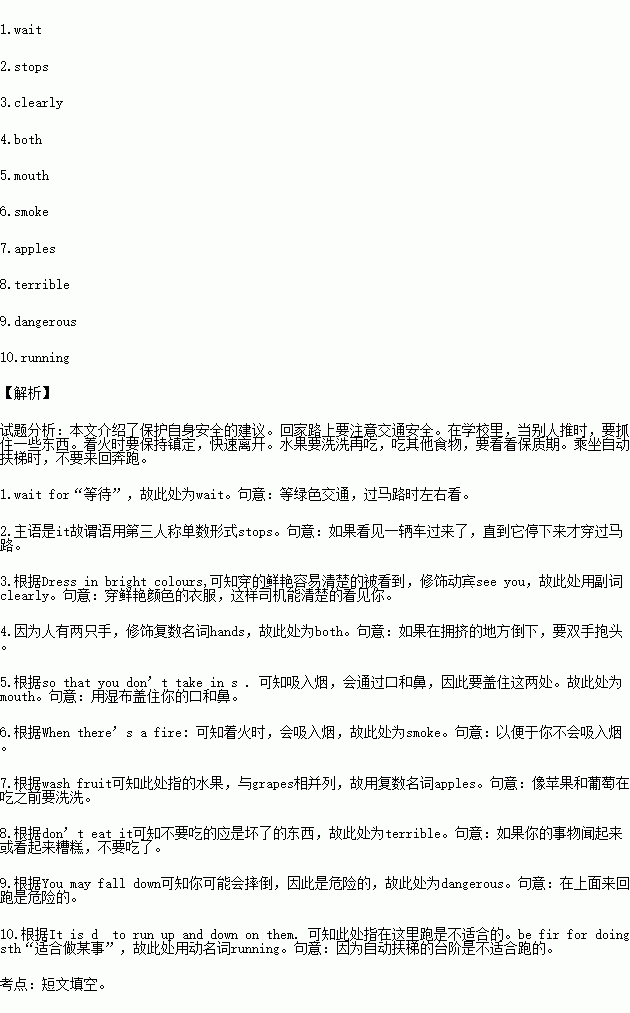 On your way home or to school: W 1. for the green traffic light, and look left and right before you cross the road. If you see a car coming, don’t cross until it really s 2. . Dress in bright colours, so the drivers can see you c 3. .