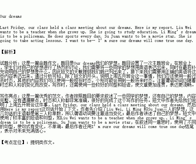上周五,你们班举行了《我们的梦想》的主题班会,在班会上同学们踊跃发言:有的想成为老师;有的想成为一名警察;有的想当医生……。请你根据下面表格的提示以“Our Dreams”为题,写一篇英语短文,报告这次班会的情况,并谈谈你自己的梦想。