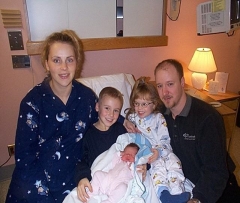 The father has his arm around ____ children. He looks proud as well. The mother is sitting ___. She looks happy ____a little tired.