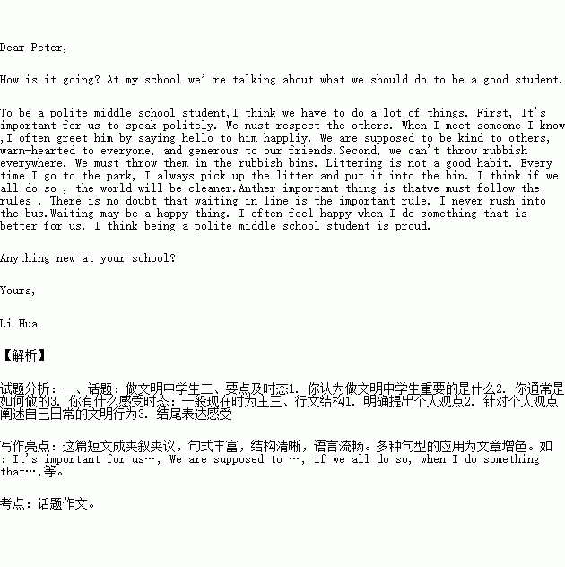 ¼ÙÈçÄã½ÐÀ£¬ÄãÃÇѧУΪÅäºÏ±±¾©Éê°ì¶¬°Â»á£¬³«µ¼ÈËÈ˶¼×öÎÄÃ÷ÖÐѧÉú¡£ÇëÄã¸ù¾ÝÒÔÏÂÌáʾ£¬¸øÄãµÄÓ¢¹ú±ÊÓÑPeterдһ·âÓʼþ£¬¸æËßËûÄãÈÏΪ×ö¸öÎÄÃ÷ÖÐѧÉúʲôÊÇÖØÒªµÄ£¬Äãͨ³£ÊÇÔõô×öµÄ£¬ÒÔ¼°ÄãµÄ¸ÐÊÜ¡£