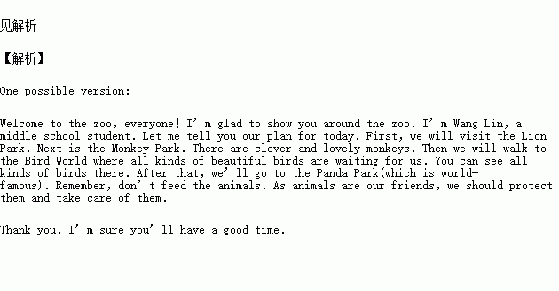 假如你叫王林,是动物保护协会的一名成员。你经常利用节假日在动物园做义务导游。你将为来自澳大利亚的中学生做导游,请你根据图示及英文提示词语写一个参观计划。