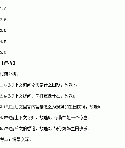A. It’s Saturday. B. You’ll give her a surprise. C. It’s February 18th. D. How do you plan to celebrate it? E. I want to buy some flowers for my mother. F. I’m going to buy a pair of jeans(牛仔裤) for myself. G. Happy birthday to your mother! |
