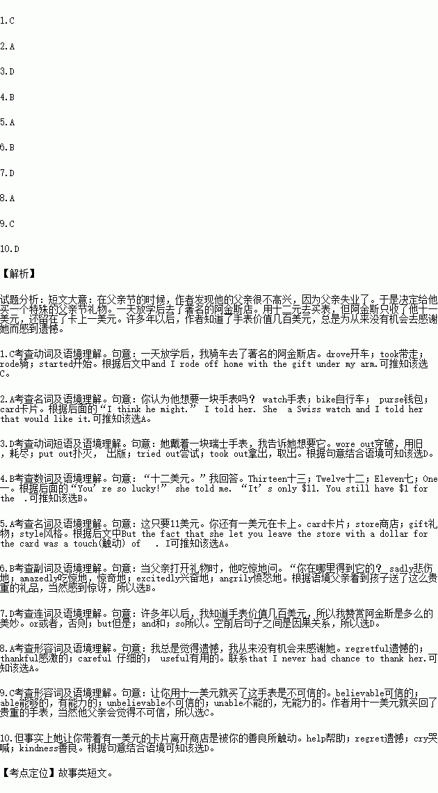 “What really amazes me to this day…my daughter.” My father said, “Letting you have the watch for 11 dollars was enough. But the fact that she let you leave the store with a dollar for the card was a touch(触动) of . I’ll never forget it.”