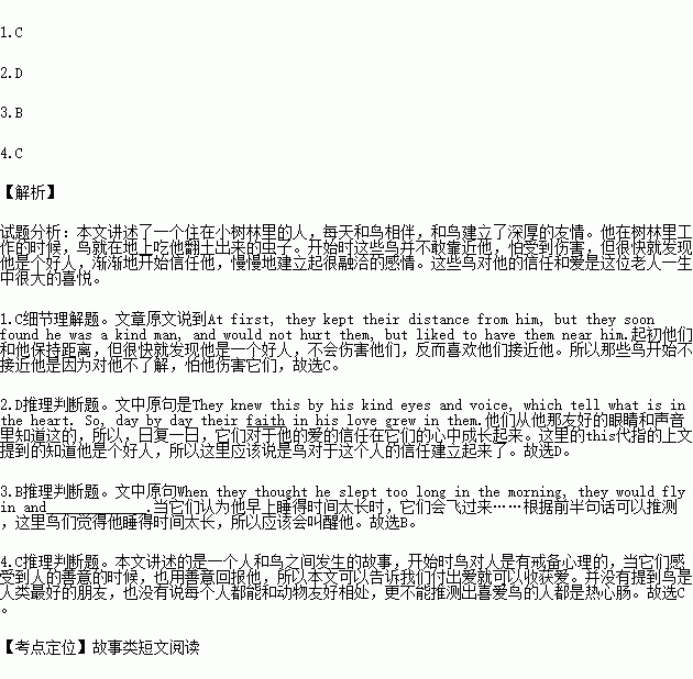 While he was at work in the grove, the birds came close to pick up the worms(蠕虫) in the fresh earth he dug up. At first, they kept their distance from him, but they soon found he was a kind man, and would not hurt them, but liked to have them near him.