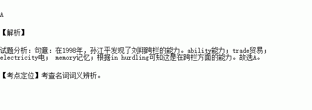In 1998, Liu Xiang’s ______ in hurdling was noticed by Sun Jiangping.