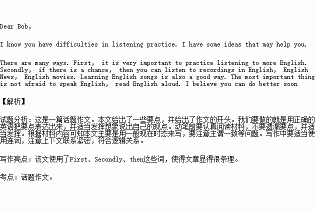 假设你叫李薇,你有一个笔友Bob,你感到英语听力有些困难,总是无法听明白所听内容。阅读完上面这篇介绍听力学习方法的文章后,聪明的你一定能帮助Bob解决他在英语过程中所遇到的问题。根据文章的内容,给Bob一些建议,并对他进行鼓励。(80词左右)