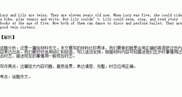 Lucy 和Lily是双胞胎(twins), 她们现在11岁了。5岁时,Lucy会骑自行车、打网球(play tennis)、写字,但Lily不会。Lily会游泳、滑冰、读故事书(story books)。现在她们都学会了跳迪斯科、芭蕾。她们是一对好姐妹。