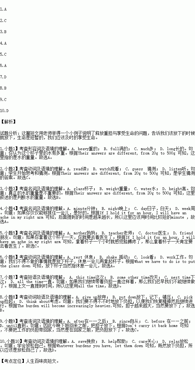A teacher was giving a talk to his students on stress(压力) management. He raised a glass of water and asked them, "How do you think this glass of water is?"