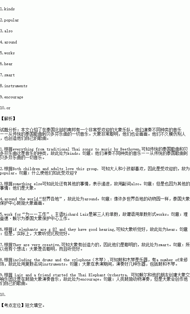 In the town of Lampang in northern Thailand, there is an unusual group of musicians. They play many different k__1.___ of music—everything from traditional Thai songs to music by Beethoven. Both children and adults love this group. What makes them so p 2. ? Is it their music? Their looks? Yes, it's both of the things, but it’s a 3. something else: they're elephants.