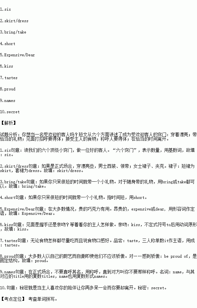 Gifts—if you are going to stay in someone’s house, 3. (带来) a small gift if you are staying for a 4. (短的) period of time, a bigger gift for longer periods. 5. (昂贵的) chocolate works in most situations. Don’t arrive empty-handed.