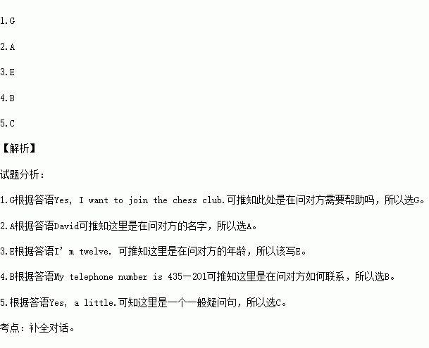 A.What’s your name? B.How can we contact(联系) you? C.Can you play chess? D.I can play chess. E.How old are you? F.What can you do? G.Can I help you? |