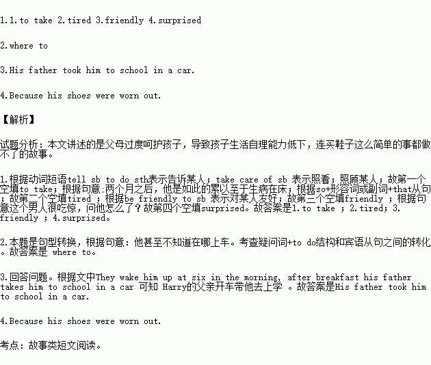 Once Harry’s father went to London on business. He would stay there for half a year. Before leaving, he told his wife ____(1) good care of their son. The woman had to get up earlier and did all what her husband did before. And two months later she was so ____(2) that she was ill in bed. Now the boy got into trouble. He couldn’t do any housework. He had to do as his mother told him. Even he didn’t know where he should get on the bus.