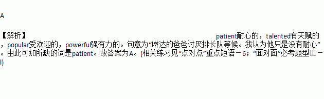 (2013南京)Linda’s father hates waiting in long lines.I think he’s just not very________.