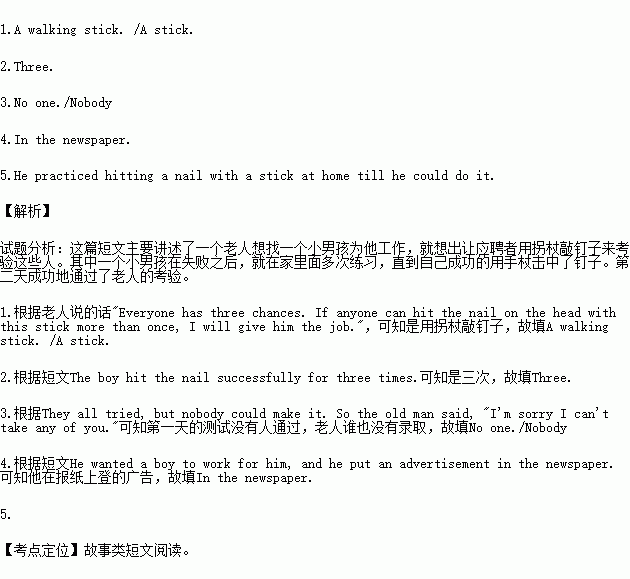 There was a post(柱子)by his desk, and there was a nail(钉子)in it. He took a walking stick and said, "Everyone has three chances. If anyone can hit the nail on the head with this stick more than once, I will give him the job."The boys thought it was easy. They all tried, but nobody could make it. So the old man said, "I'm sorry I can't take any of you."And they left.
