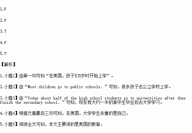 In the United States,children start school when they are five years old.In some states they must stay in school until they are sixteen.Most students are seventeen or eighteen years old when they leave secondary(中等的)schools.There are two kinds of schools in the United States:public schools and private(私立的)schools.Most children go to public schools.Their parents do not have to pay for their education because the schools receive money from the government.If a child goes to a private school,his parents have to get enough money for his schooling.Some parents still prefer private schools,though they are much more expensive.Today about half of the high school students go to universities after they finish the secondary school.A student at the state university does not have to pay very much if his parents live in that state.But many students work while they are studying at universities.In this way they develop good working habits and live by their own hands.