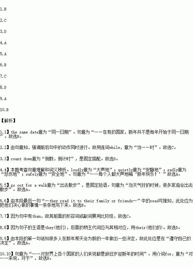 In many countries,the new year begins on 1st January,but people start celebrating on 31st December,New Year’s Eve.In New York many people go to celebrate in Times Square.________they’re waiting for the New Year,they listen to music,sing traditional songs and have fun.Just before 12 o’clock,everyone________down from 10:10,9,8…As soon as it’s 12 o’clock,everyone shouts very_______,“Happy New Year!”