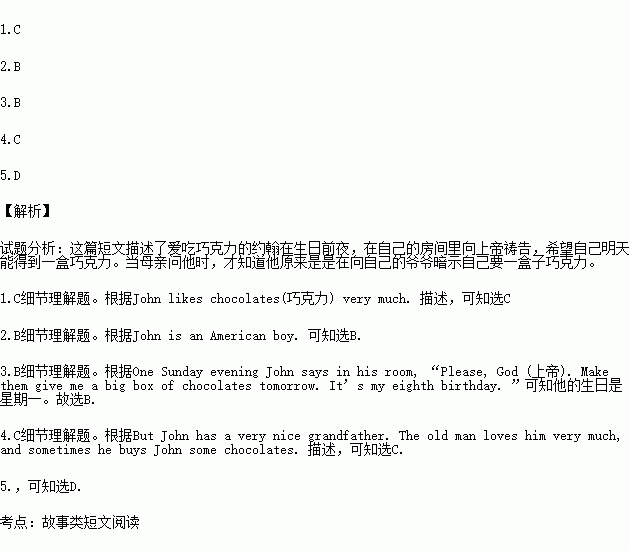 John is an American boy. His family is in China now. John likes chocolates very much. But his mother doesn’t give him any. They are not good for him, she thinks. But John has a very nice grandfather. The old man loves him very much, and sometimes he buys John some chocolates. Then his mother lets John eat them. She wants to make the old man happy. One Sunday evening John says in his room, “Please, God (上帝). Make them give me a big box of chocolates tomorrow. It’s my eighth birthday.” His mother says,“God can’t hear you, my boy.” “I know, but my grandfather is in the next room. He can hear.”