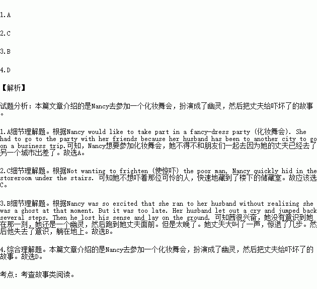 Nancy would like to take part in a fancy-dress party (化妆舞会). She had to go to the party with her friends because her husband has been to another city to go on a business trip. Later that night, she was busy in dressing up herself as a ghost, including putting on masks and some special costumes.