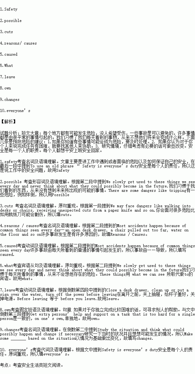 No one wants to get hurt. Some accidents are avoidable(可避免的). Most accidents happen because of common things seen every day—an open desk drawer, a chair pulled out too far, water on the floor and so on. We slowly get used to these things we see every day and never think about what they could possibly become in the future.