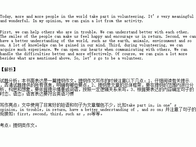 当今,社会上有许多人处于困境需要帮助,因此,越来越多的人参加志愿工作。请以The benefits of being a volunteer为题写一篇短文谈谈你对志愿工作好处的看法。主要内容如下: