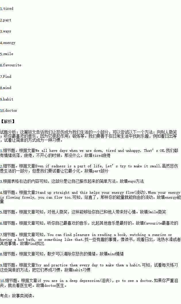 These ways will cheer you up when you are down, but don’t just use them when you are sad. Try and practice them every day to make them a habit. You will be surprised to learn that these simple ways will keep your sadness away. But if you are in a deep depression (沮丧), go to see a doctor.