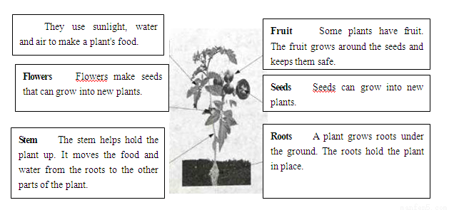 A plant is a living thing. It uses its many parts to grow from a small seed to a large plant. Each part helps the plant stay healthy. Plants also need sunlight to grow. They get light from the sun and minerals from the soil. These things help the plant stay alive and grow.