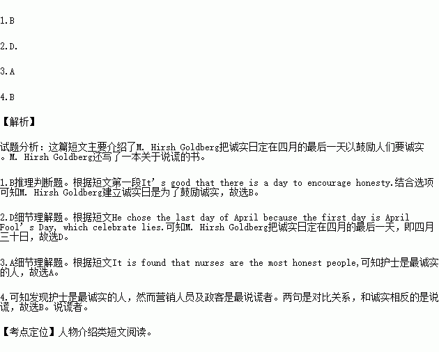 M. Hirsh Goldberg wrote a book on telling lies. He said in his book that almost all person lie about 200 times a day. In our daily life, a typical(典型的)life for a man is “I did not drink that much” and for a woman is “Nothing is wrong, I’m fine.” It is found that nurses are the most honest people, while sales people and politicians(政客)are the biggest liars.