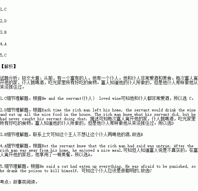 But the servant knew that the rich man had said was untrue. After the rich man was away from his home, he enjoyed a nice meal. Because he drank too much, he was drunk and fell to the ground. When the rich man came back, he couldn’t find his food and his wine. He became very angry. He woke the servant up. But the servant told his story very well. He said a cat had eaten up everything. He was afraid to be punished(惩罚), so he drank the poison to kill himself.
